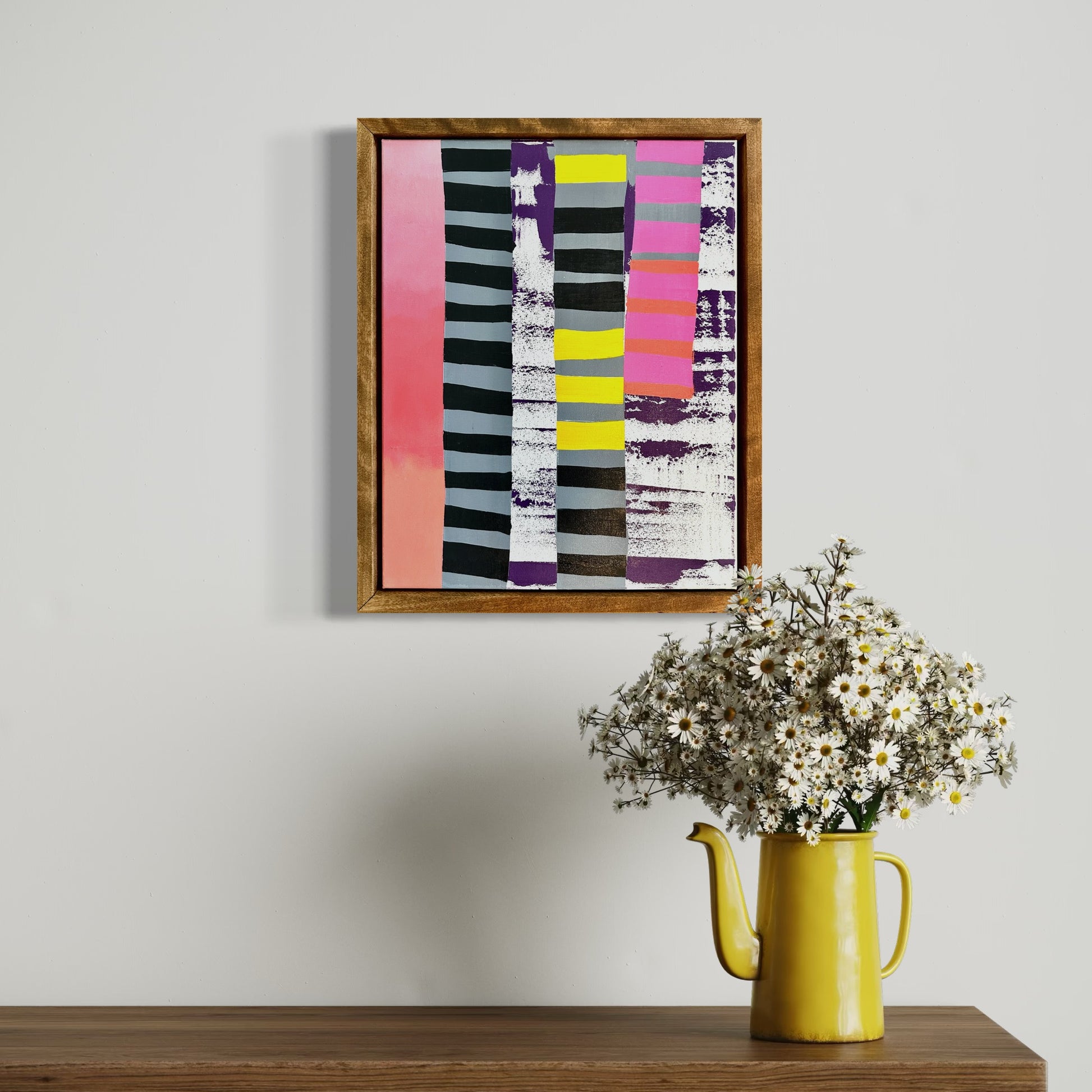 Painted on cotton canvas using layered acrylic and mixed media, this piece balances bold contrast with quiet space. The natural wood floating frame, handmade by Derek Henderson, adds a warm, gallery-ready finish.