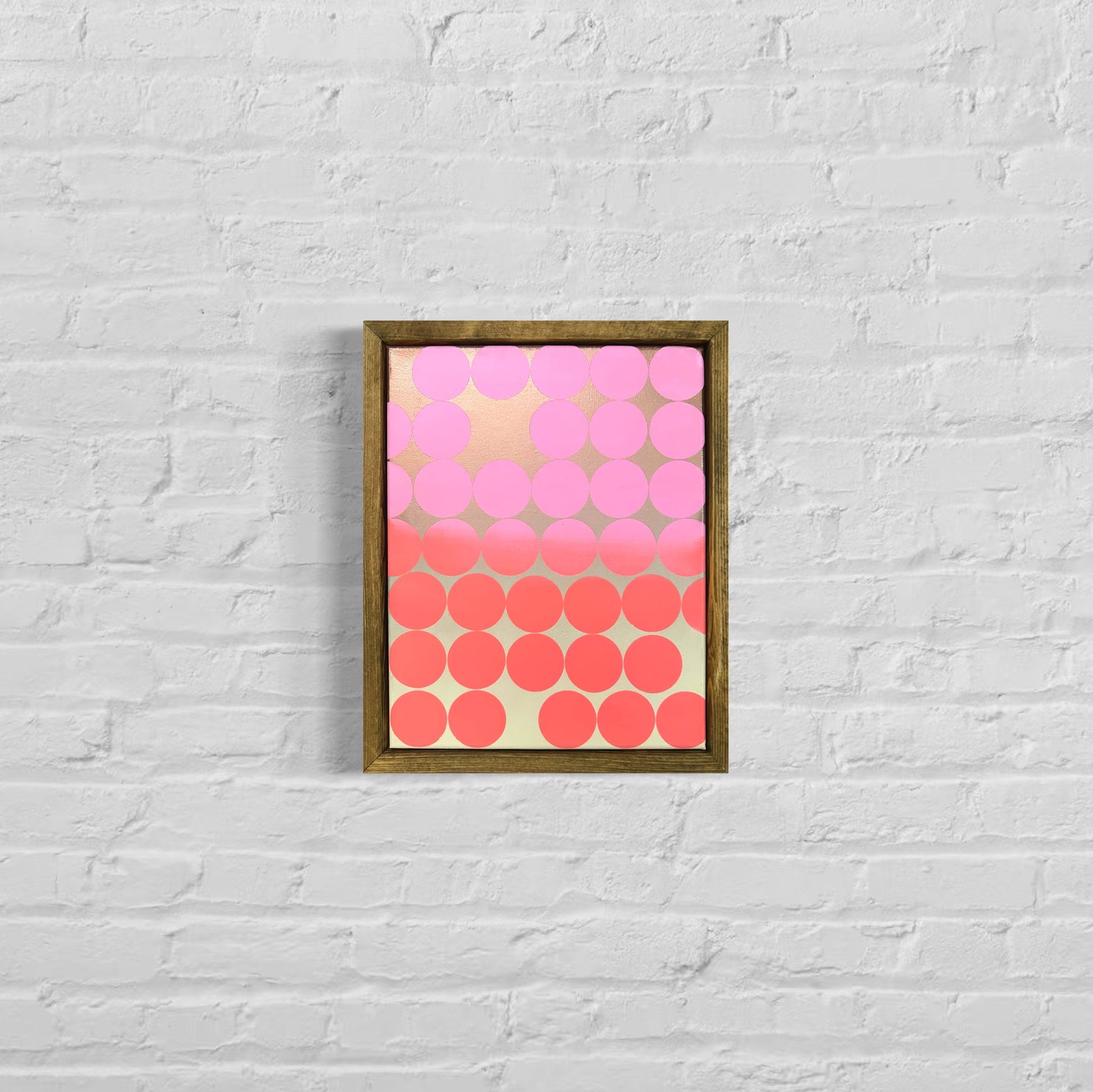 A bold and expressive abstract painting on stretched canvas featuring vibrant pink circular forms against rich coral and red tones. The layered composition creates dynamic visual energy while maintaining a cohesive color harmony that draws the eye inward.