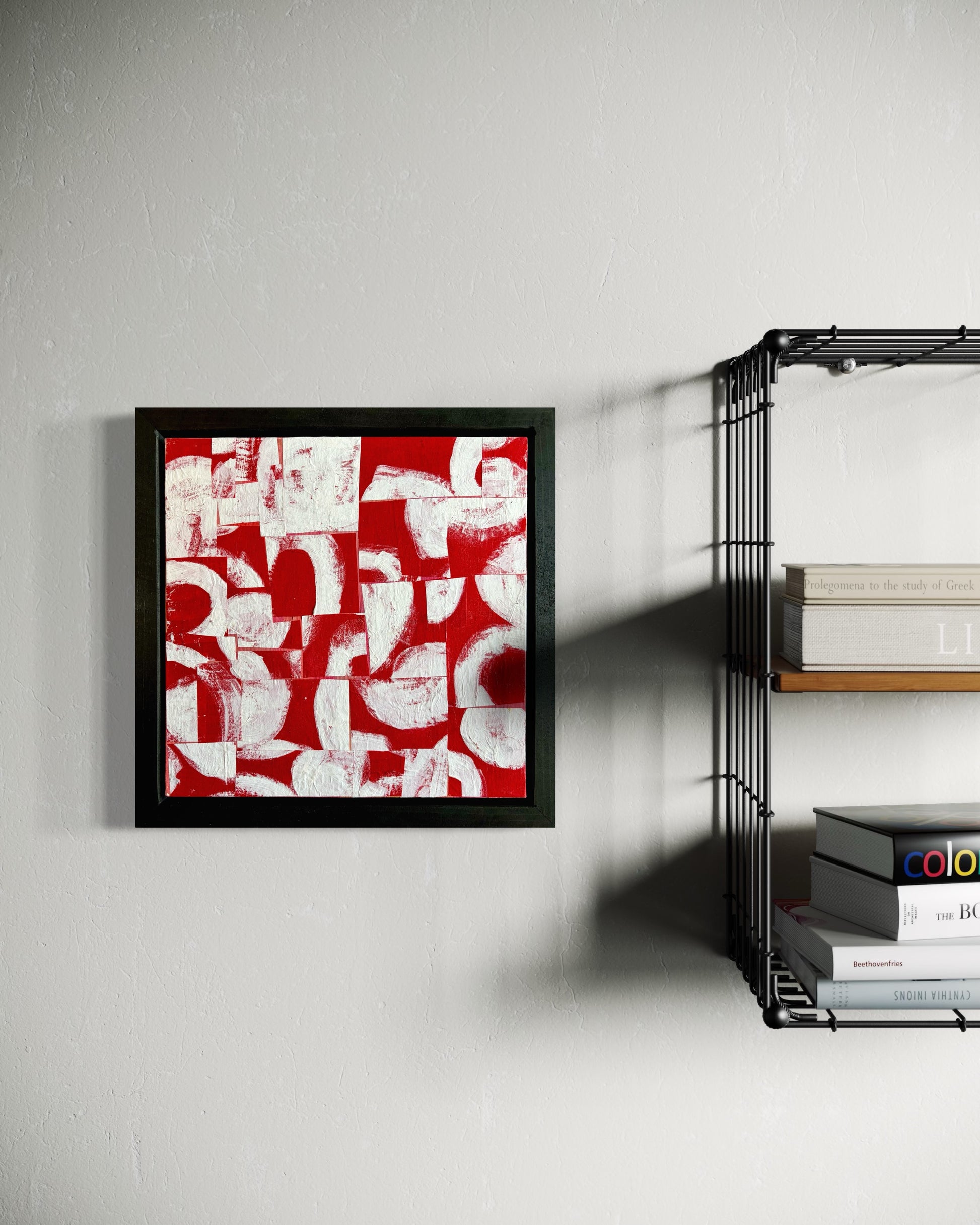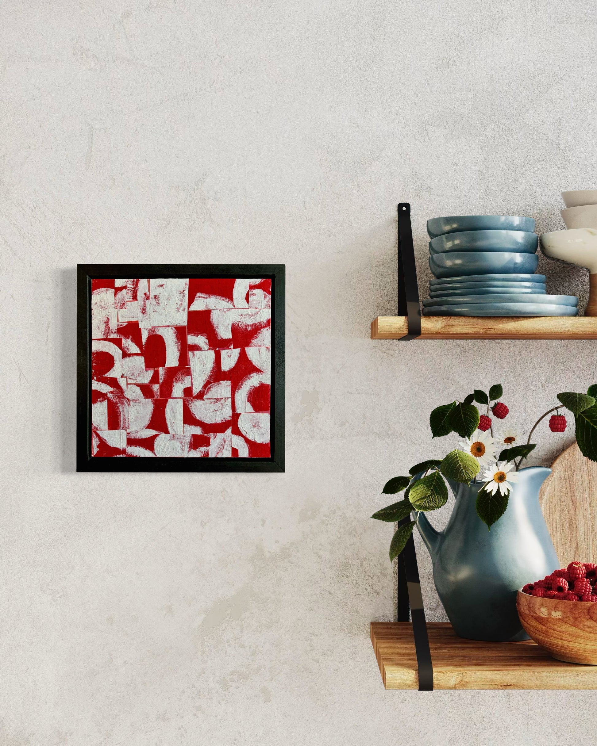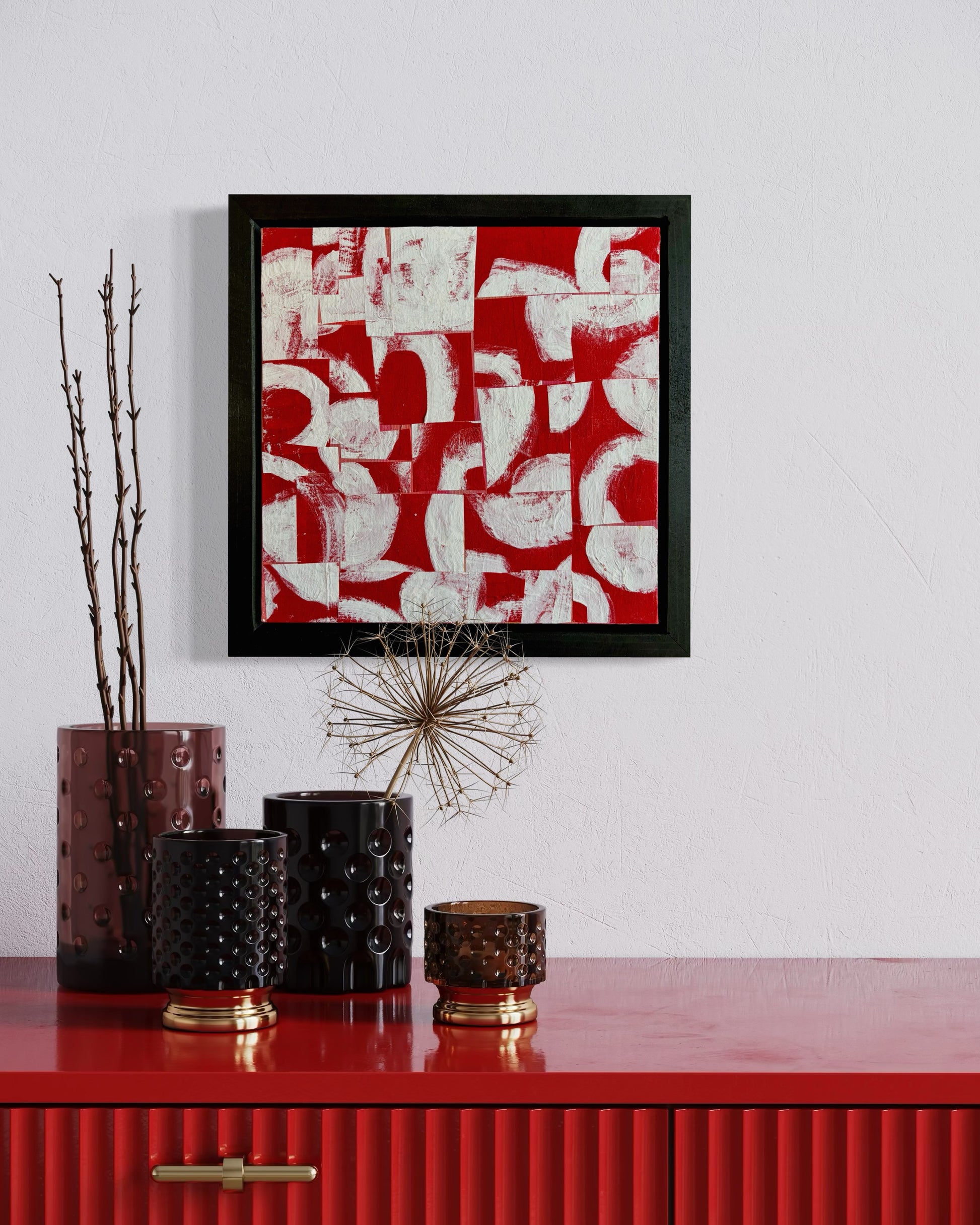 A vibrant abstract composition where bold red organic shapes dance across a clean white canvas. This contemporary piece brings energy and movement to any space, with its playful interplay of form and negative space. The striking contrast creates visual intrigue while maintaining a sense of balance and harmony.